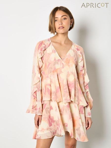 Apricot Pink Floral Chiffon Ruffle Mini Dress
