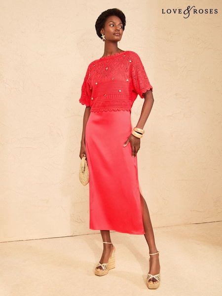 Love & Roses Red Knitted Crochet 2 in 1 Midi Dress With Nautical Charm Details