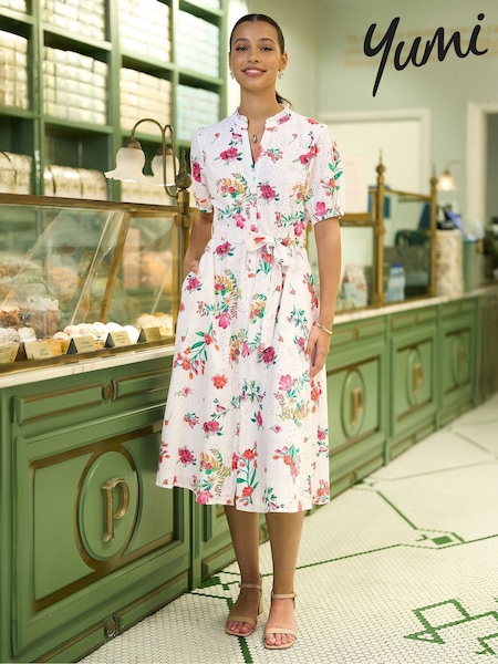Yumi White Floral Print Cotton Broderie Anglaise Midi Shirt Dress