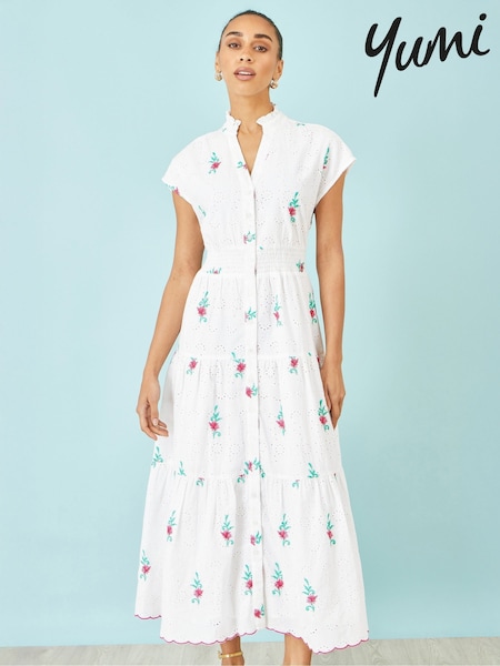 Yumi White Cotton Broderie Anglaise Embroidered Midi Dress