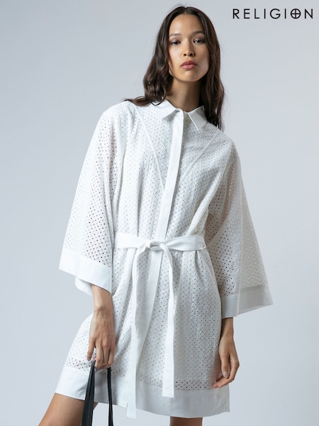 Religion White Embroidery Anglais Ffion Pretty Tunic Dress With Kimono Sleeve And Tie Belt