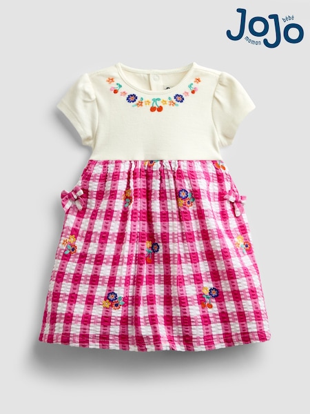 JoJo Maman Bébé Pink Gingham Fruit Embroidered Seersucker Combo Dress