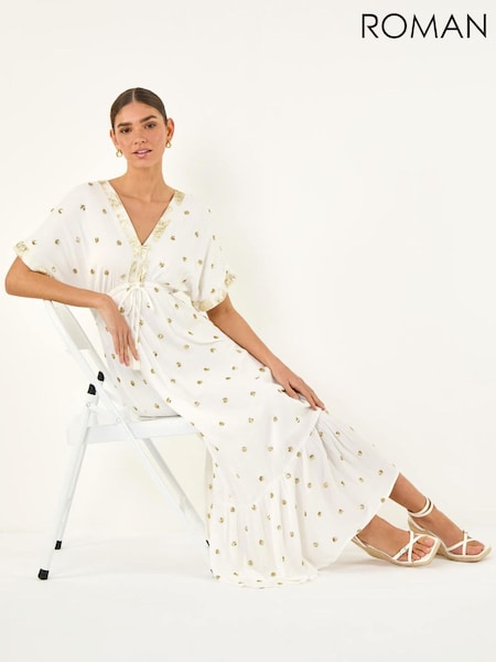 Roman White Sequin Embellished Tassel Midi Dress