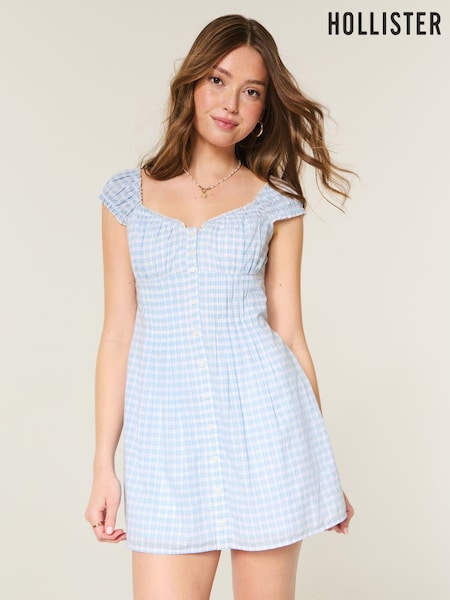 Hollister Light Blue Gingham Check Button Through Mini Dress