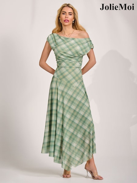 Jolie Moi Green Asymmetric Draped Mesh Maxi Dress