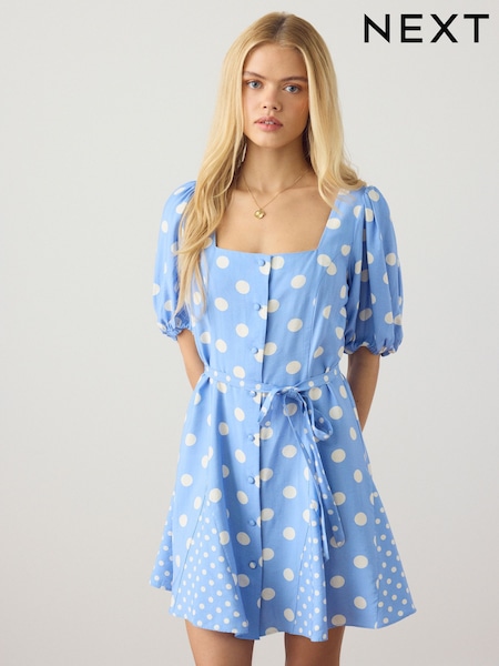 Blue Polka Dot Puff Sleeve Button Through Mini Dress