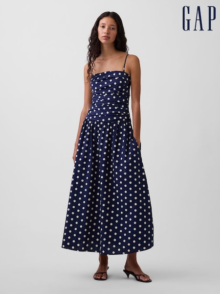 Gap Navy Polka Dot Poplin Drop-Waist Maxi Dress