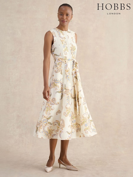 Love & Roses Ivory Floral Linen Scallop Detail Midi Dress