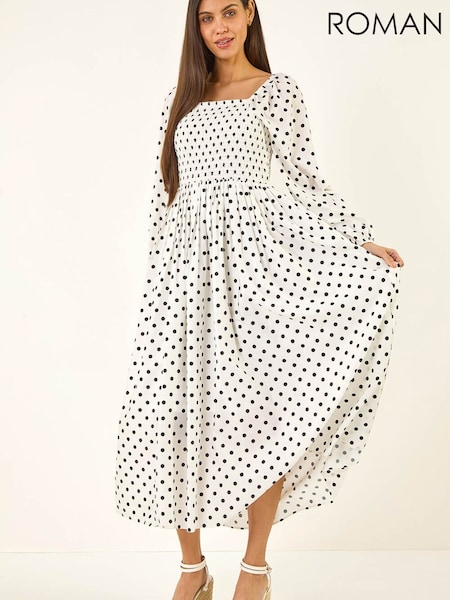 Roman White Spot Shirred Midi Dress