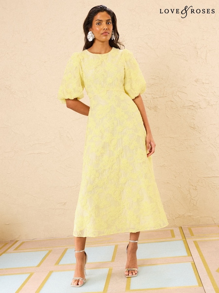Love & Roses Yellow Textured Puff Sleeve Crew Neck Midi Dress