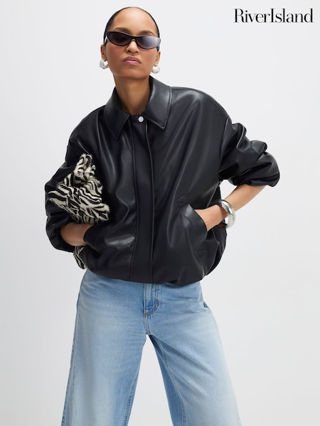 River Island Black Bubble Hem Faux Leather Bomber Jacket