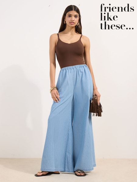 Friends Like These Light Wash Chambray Petite Elasticated Waist, Palazzo Wide Leg Jeans