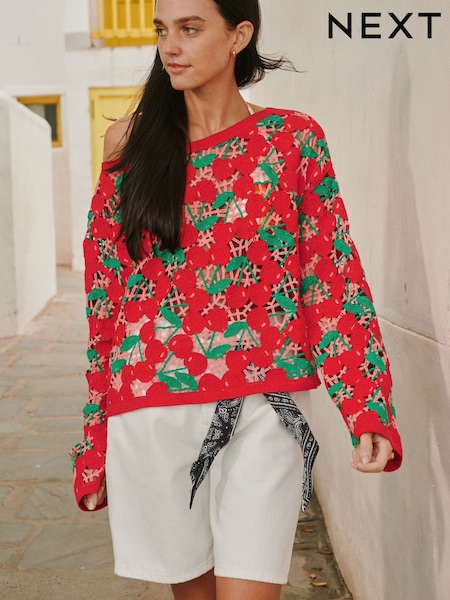 Red Cherry Cotton Rich Crochet Long Sleeve Off The Shoulder Jumper
