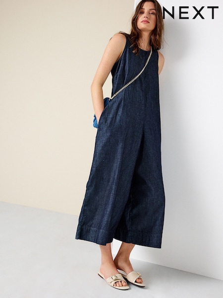Rinse Blue Open Back Beach Cropped Lightweight Denim Jumpsuit