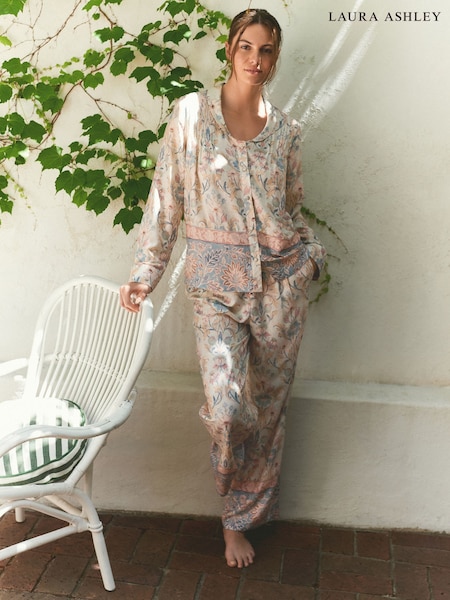 Laura Ashley Cream/Blue Semington Boarder Print Button Through Long Sleeve Pyjamas Set