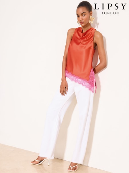 Lipsy Red Pink Lace Hem Detail Cowl Halter Neck Top