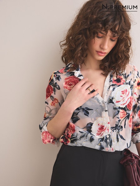 Ecru Floral N.Premium Sheer Flocked Velvet Shirt