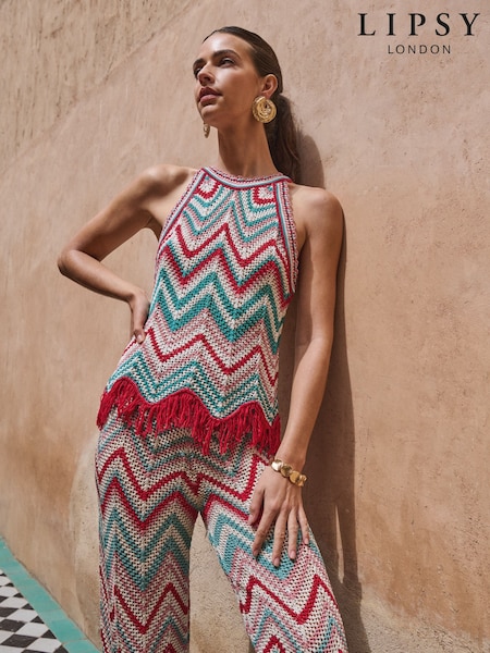 Lipsy Green Zig Zag Fringe Detail Halter Top