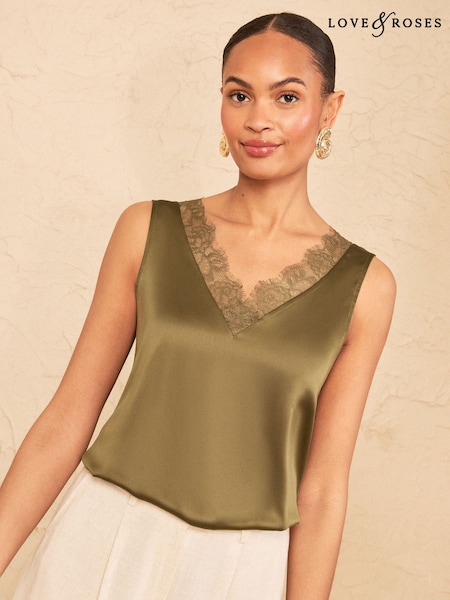 Love & Roses Khaki Green Satin Front Lace Trim V-Neck Vest