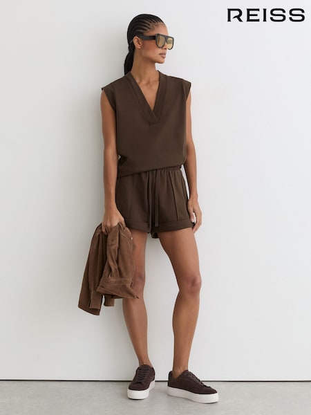Reiss Chocolate Brown Willa Cotton-Blend Sleeveless V-Neck Sweat Top