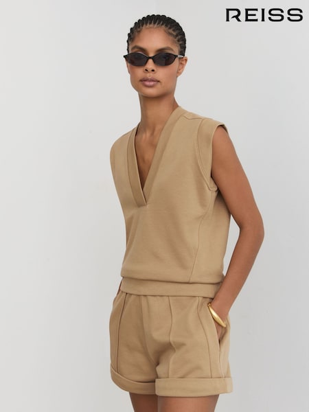 Reiss Tan Neutral Willa Cotton-Blend Sleeveless V-Neck Sweat Top