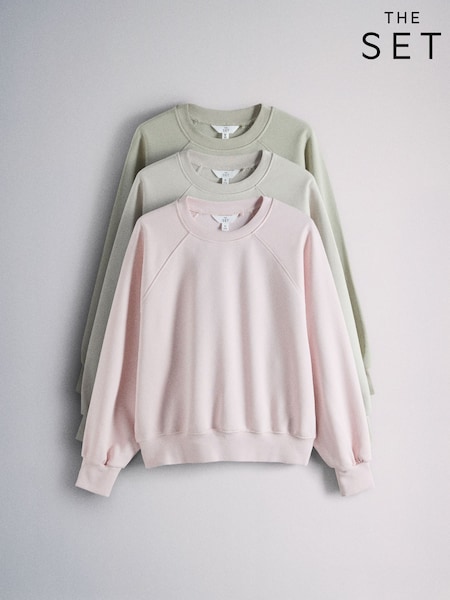 The Set 3 Pack Raglan Sleeve Crew Neck Sweat Top Khaki Green/Pink/Stone
