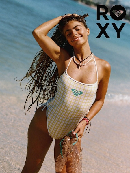 Roxy Cream The Swell One Plaid Check Square Neck Logo Swimsuit