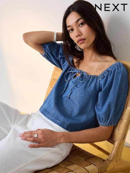 Mid Blue Puff Sleeve Lightweight Denim Top