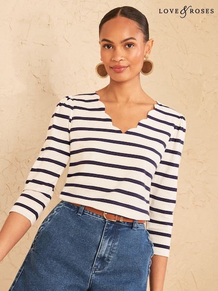 Love & Roses Ivory Stripe 3/4 Sleeve Scallop V-Neck Jersey Top