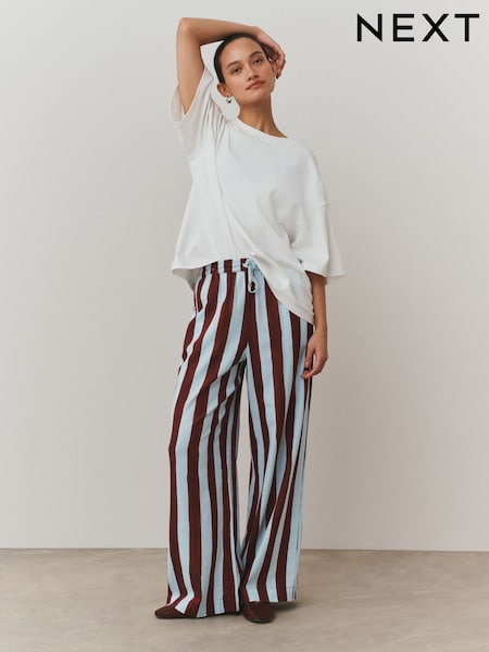 Blue/Burgundy Stripe Pull On Wide Leg Trousers With Linen
