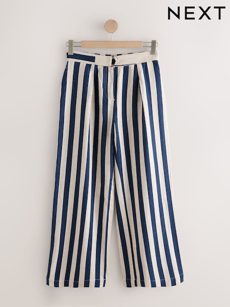 Navy Blue/Stone Stripe Linen Blend Wide Leg Trousers with Belt