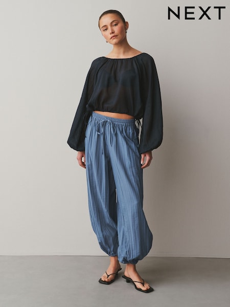 Blue Pleated Texture Balloon Leg Trousers