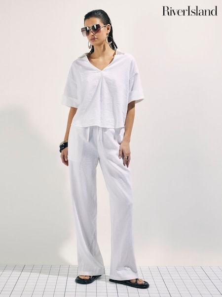 River Island White Elasticated Linen Blend Tapered Leg Trousers