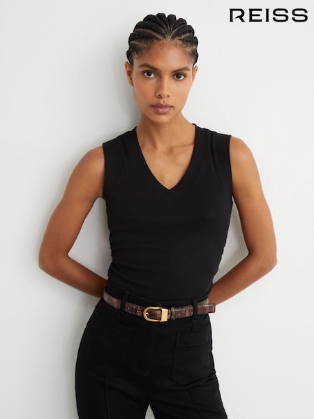 Reiss Black Sandy Stretch-Cotton Rib Ruched V-Neck Vest