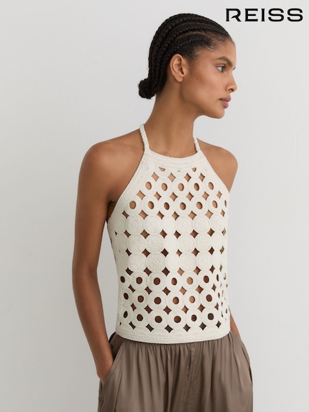 Reiss White Celia Cotton Cut-Out Knitted Halterneck Top