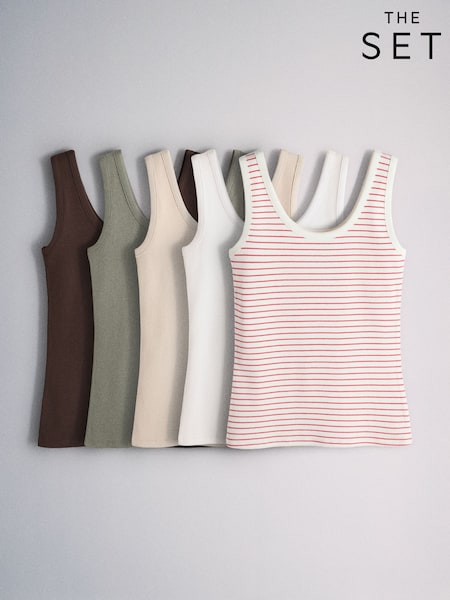 The Set 5 Pack Ribbed Scoop Neck Vests Chocolate/Khaki/White/Brown/Stripe