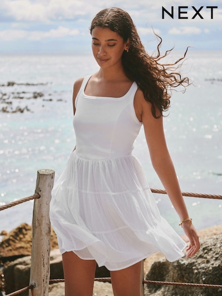White Square Neck Mini Tiered Summer Dress