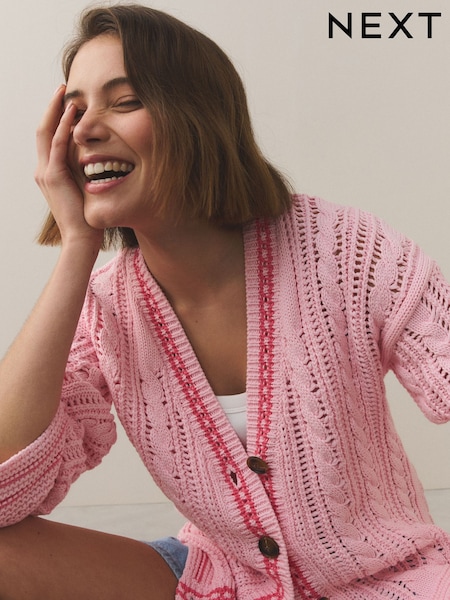 Pink/Red Tipped 100% Cotton Cricket Style Cable Knit Cardigan