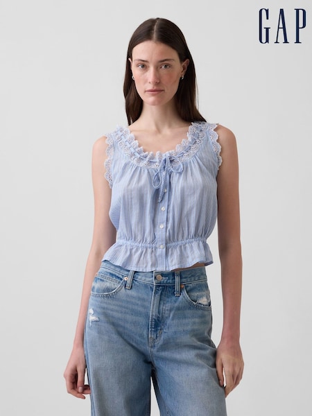 Gap Blue Eyelet Tie-Front Crop Peplum Scoop neck Top