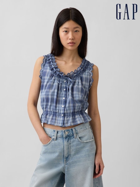 Gap Blue Check Eyelet Tie-Front Crop Peplum Scoop neck Top