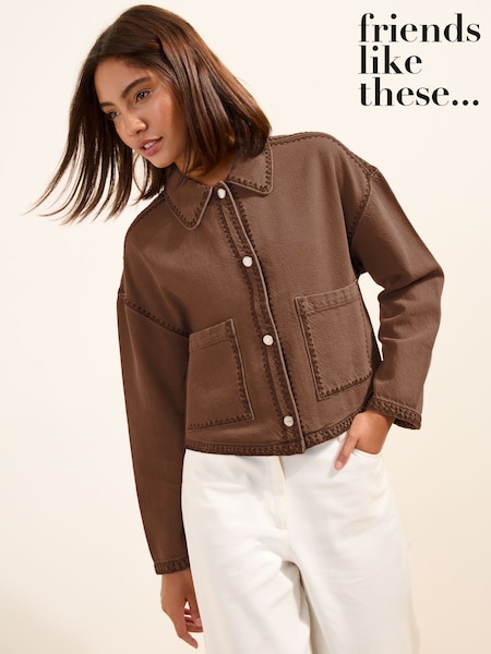Friends Like These Chocolate Brown Short Collared Stitch Detail Denim Jacket