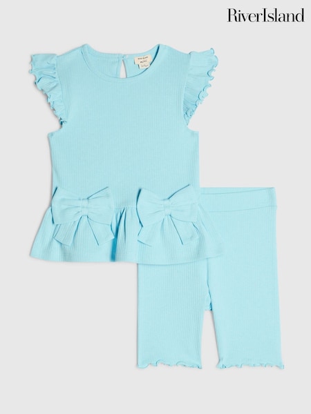 River Island Blue Peplum Bow Top & Rib Shorts Set