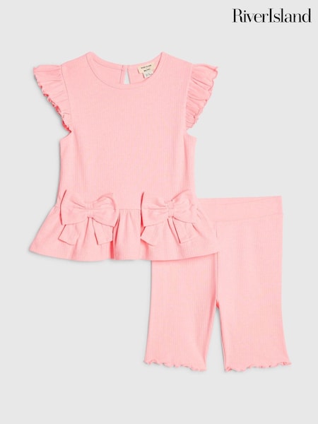 River Island Pink Peplum Bow Top & Rib Shorts Set