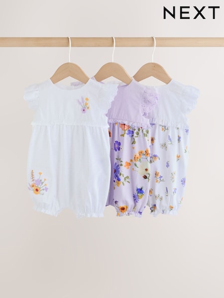 Purple and White Floral Broderie Broderie 3 Pack Baby Rompers