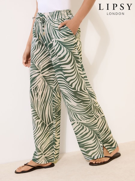 Lipsy Green Tropical Print Linen-Look Wide Leg Trousers
