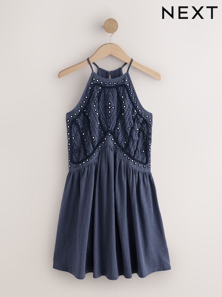 Washed Navy Embroidered Mirror Detail High Neck Mini Dress