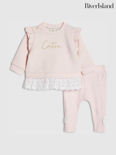 River Island Pink Broderie Frill Sweatshirt & Leggings Set