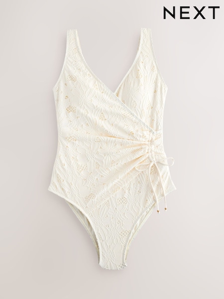 Cream Broderie Ruched Side Tummy Shaping Control Swimsuit