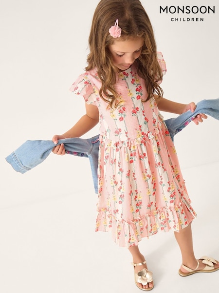 Monsoon Pink Frilly Floral Stripe Print Dress