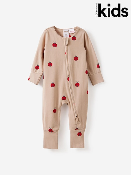 Cotton On Latte Cream/Lady Bug Long Sleeve Zip Sleepsuit